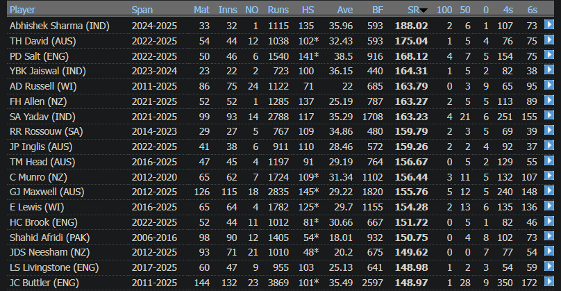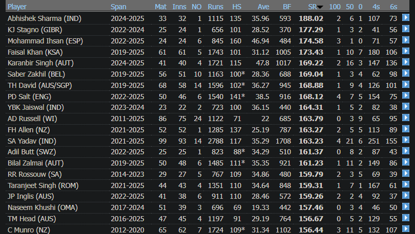 If we don’t apply a filter for test playing nations, we can usually see associate batters alongside international batters on record lists. This is common. For instance, we all know how impactful and dangerous Tim David is on the crease. Among international T20I batters he is Abhishek’s tightest contender in best career strike rate. And he is behind four associate batters on the list. But Abhishek despised competition. He just didn’t want to appear on leaderboards. He wanted frickin alienation.